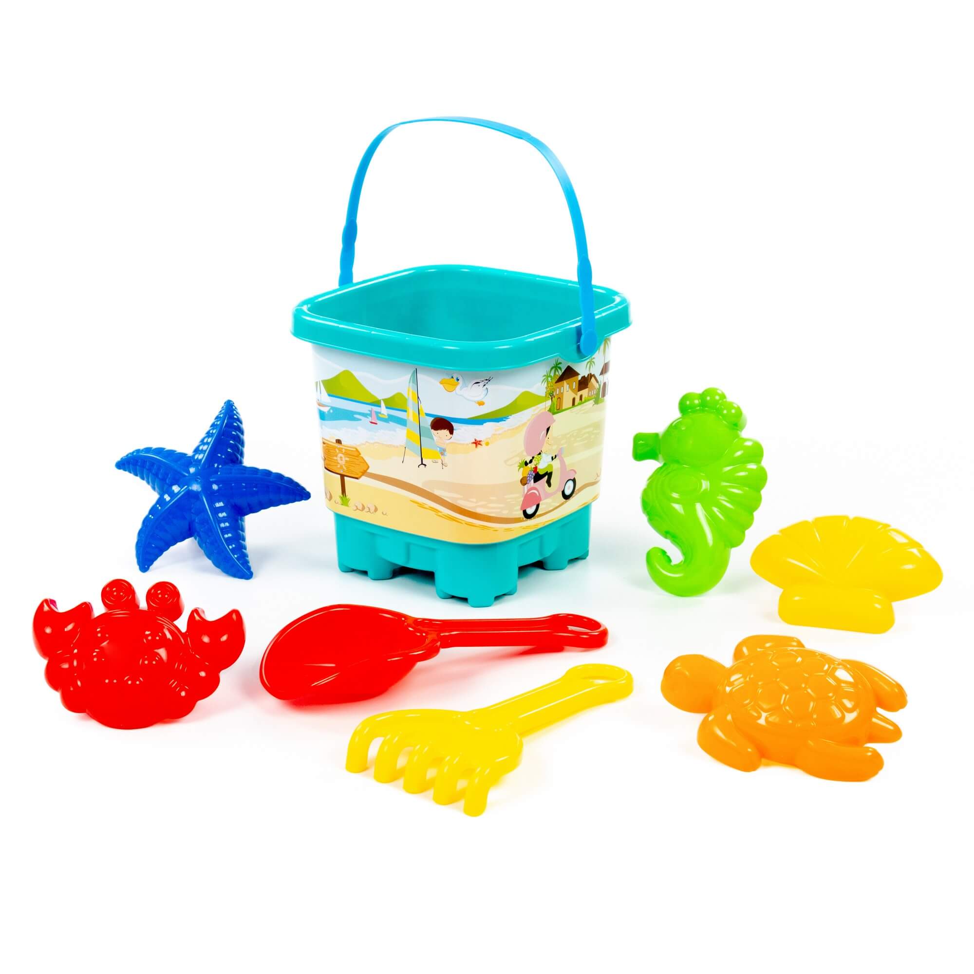 Набор №594: ведро-замок большое с наклейкой, совок №10, грабли №10, формочки