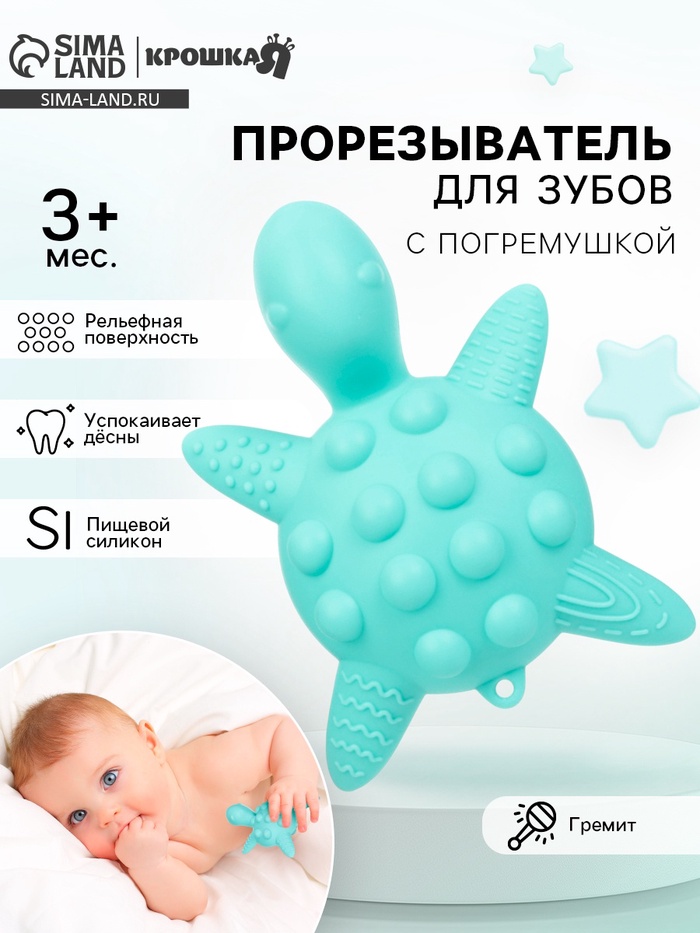 Прорезыватель силиконовый для зубов с погремушкой Крошка Я Черепаха 11×7.5 см бирюзов