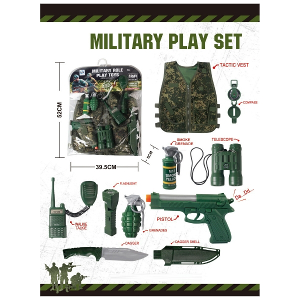 Набор Военный жилет,дымовая шашка,бинокль,пистолет,нож,гранат,рация,фонарь,компас, 28*5*48 см